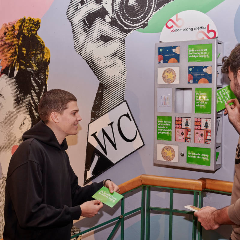 Boomerang Media ist in Österreich der kompletteste Anbieter im Bereich Außenwerbung und Ambient Media. Promotion, Sampling, DOOH und MOOH, Projektionen, Guerilla Marketing und vieles mehr – seit 1994 generieren die Werbeformen von Boomerang Media täglich Millionen von Kontakten. Jede Message erreicht punktgenau die geeignete Zielgruppe, am geeigneten Ort, zum richtigen Zeitpunkt – und liefert somit maximale Relevanz. Auch für Ihre Bedürfnisse findet Boomerang Media eine maßgeschneiderte, affine und eine für Ihre (potentiellen) Kund:innen berührende Werbelösung.